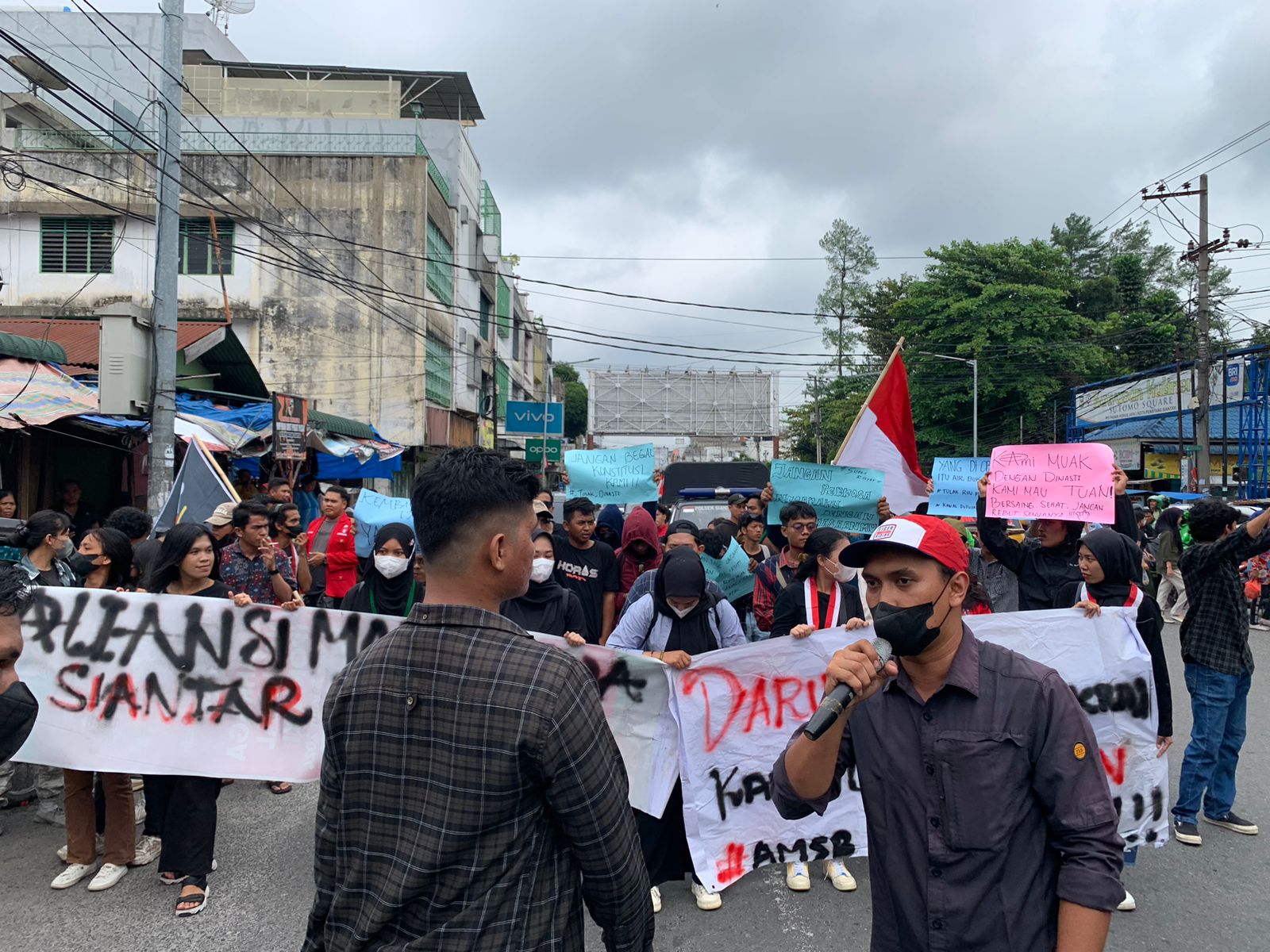 Orasi disambung didepan Pajak Horas, Andry Napitupulu mengajak Pedagang kaki lima, Juru Parkir, Ojek Online, Supir dan seluruh elemen pemuda dan mahasiswa se-kota Pematangsiantar untuk bergabung bersama-sama turun kejalan menyuaralan aspirasi demi menjaga NKRI kita tercinta ini karena negara sedang darurat dan rezim hari ini sangat mengerikan sehingga membuat masyarakat sengsara.-Ucap Koordinator Kelompok Mahasiswa Peduli Demokrasi.